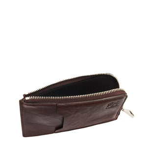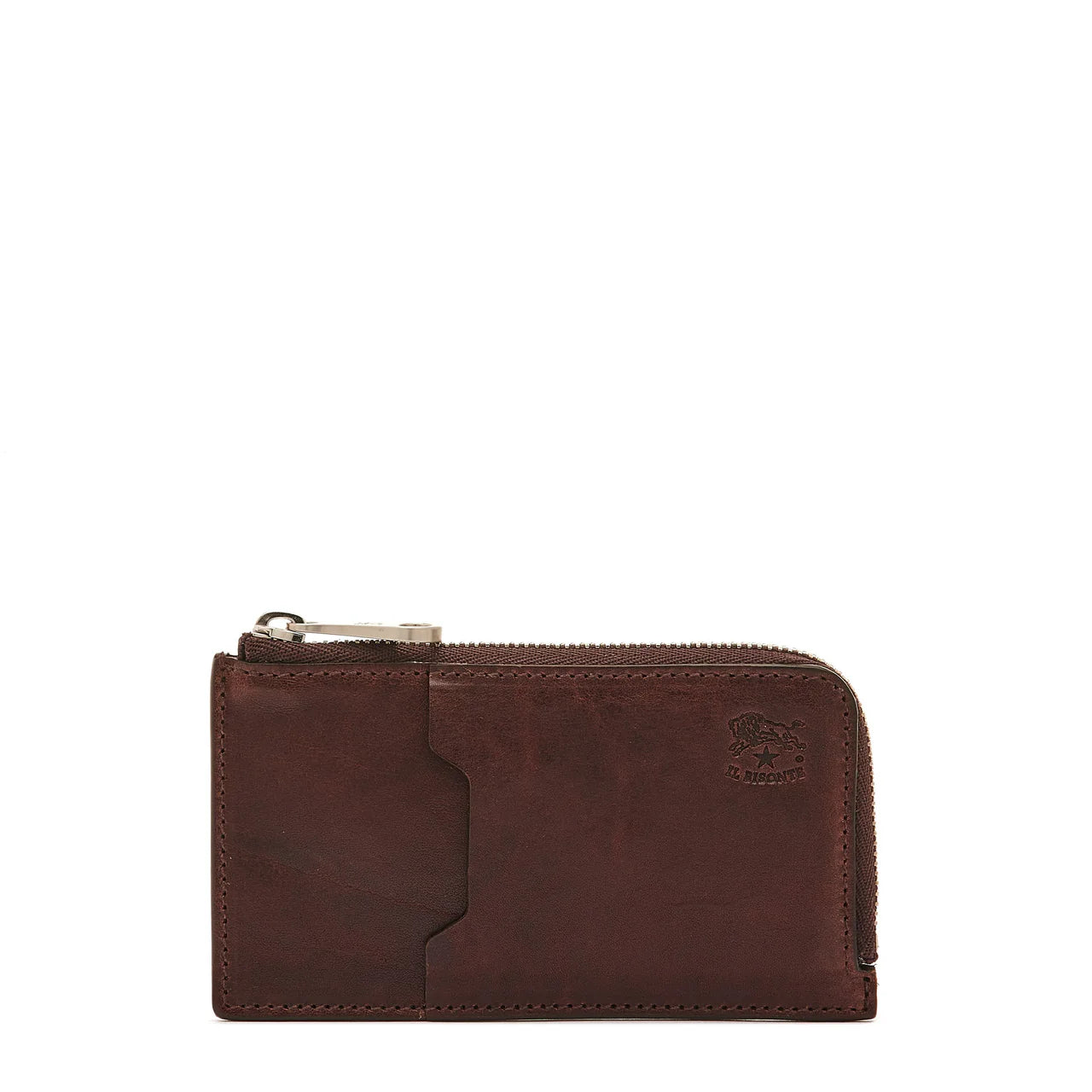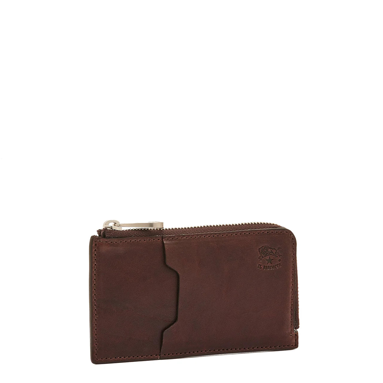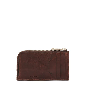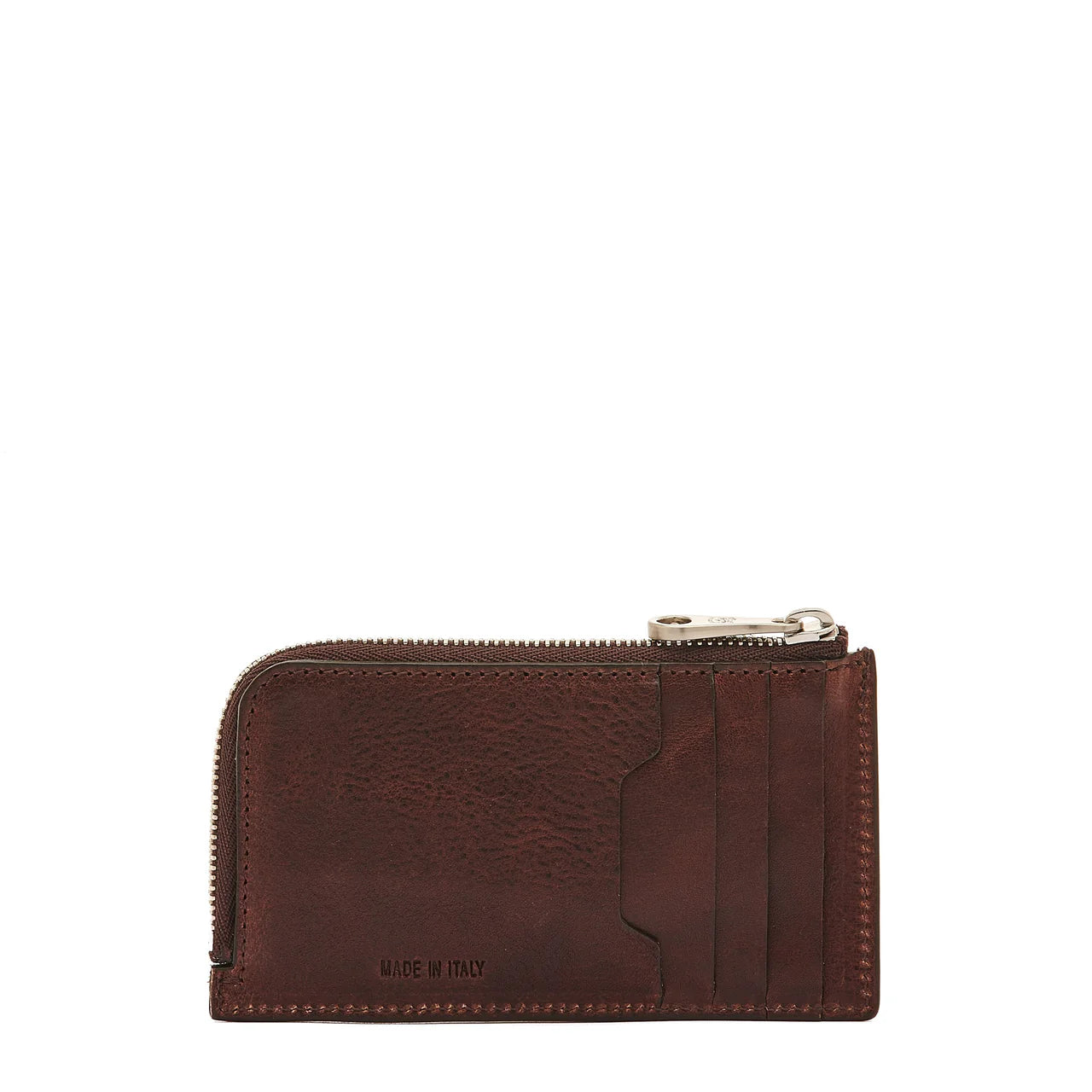 Das Kartenetui in schlichtem Design, unterstreicht die Natürlichkeit und Schönheit von pflanzlich gegerbtem Leder. Fünf Aussenfächer für Karten mit ikonischem geometrischem Umriss. Innenfutter aus Baumwollcanvas mit Fach für Geldscheine und ein Münzfach mit Reissverschluss.