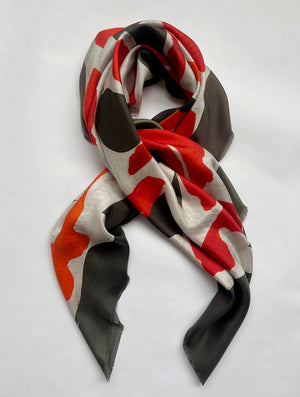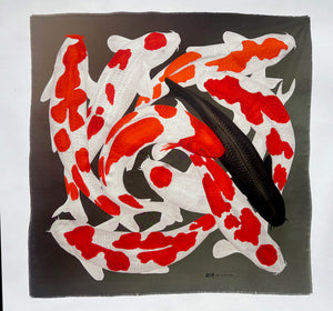 Ein farbenfrohes Foulard mit neun verschiedenen Koi-Arten.100 cm x 100 cmItalienischer Seiden-Twill mit ausgefransten Kanten bedruckt in England.Designed in London von der Schweizer Textildesignerin Arlette Ess.