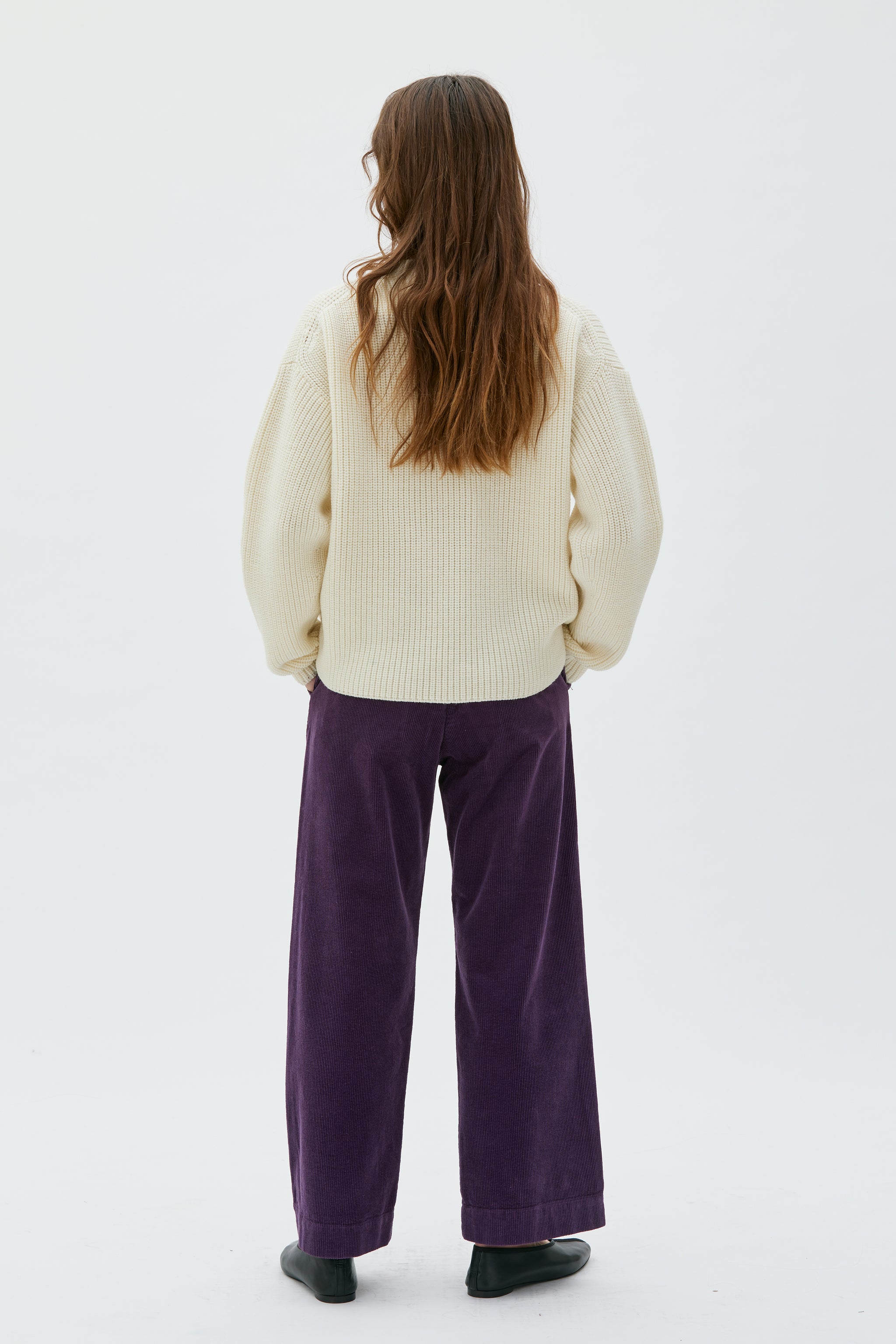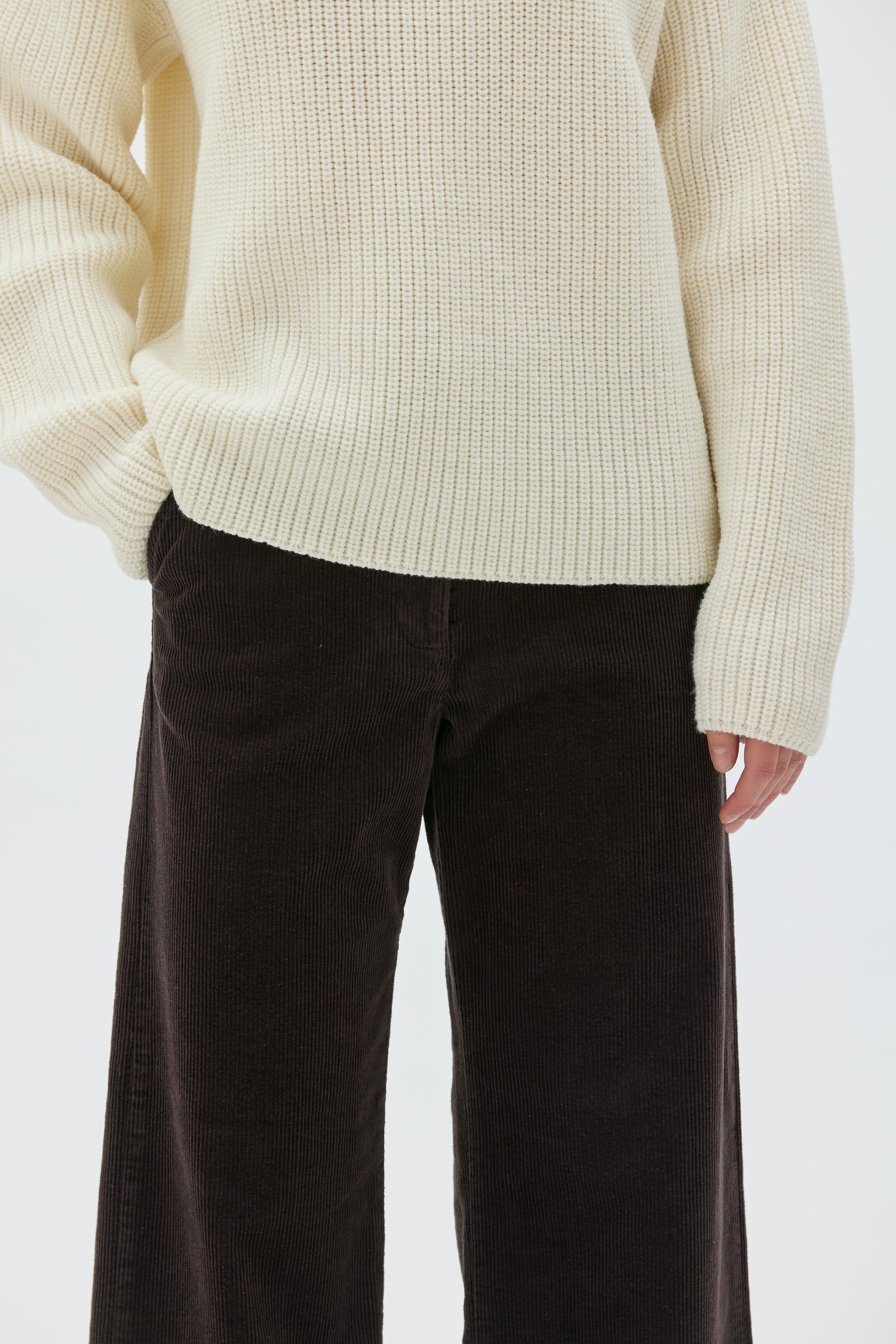 Er hat ein dickes, schweres Rippenmuster, eine zeitlose, lockere, voluminöse Form und abfallende Schultern.