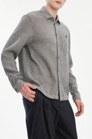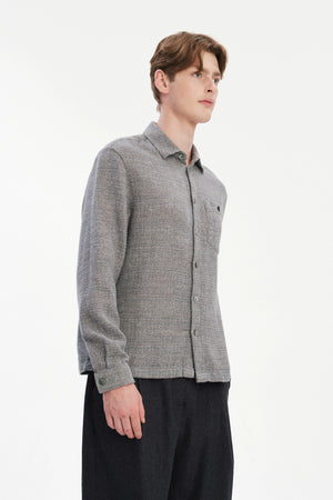 Das Architect Shirt aus portugiesischer Baumwolle und Hanf, fasziniert mit seiner dreifarbigen Musterung, die sich bei jeder Bewegung subtil verändert.