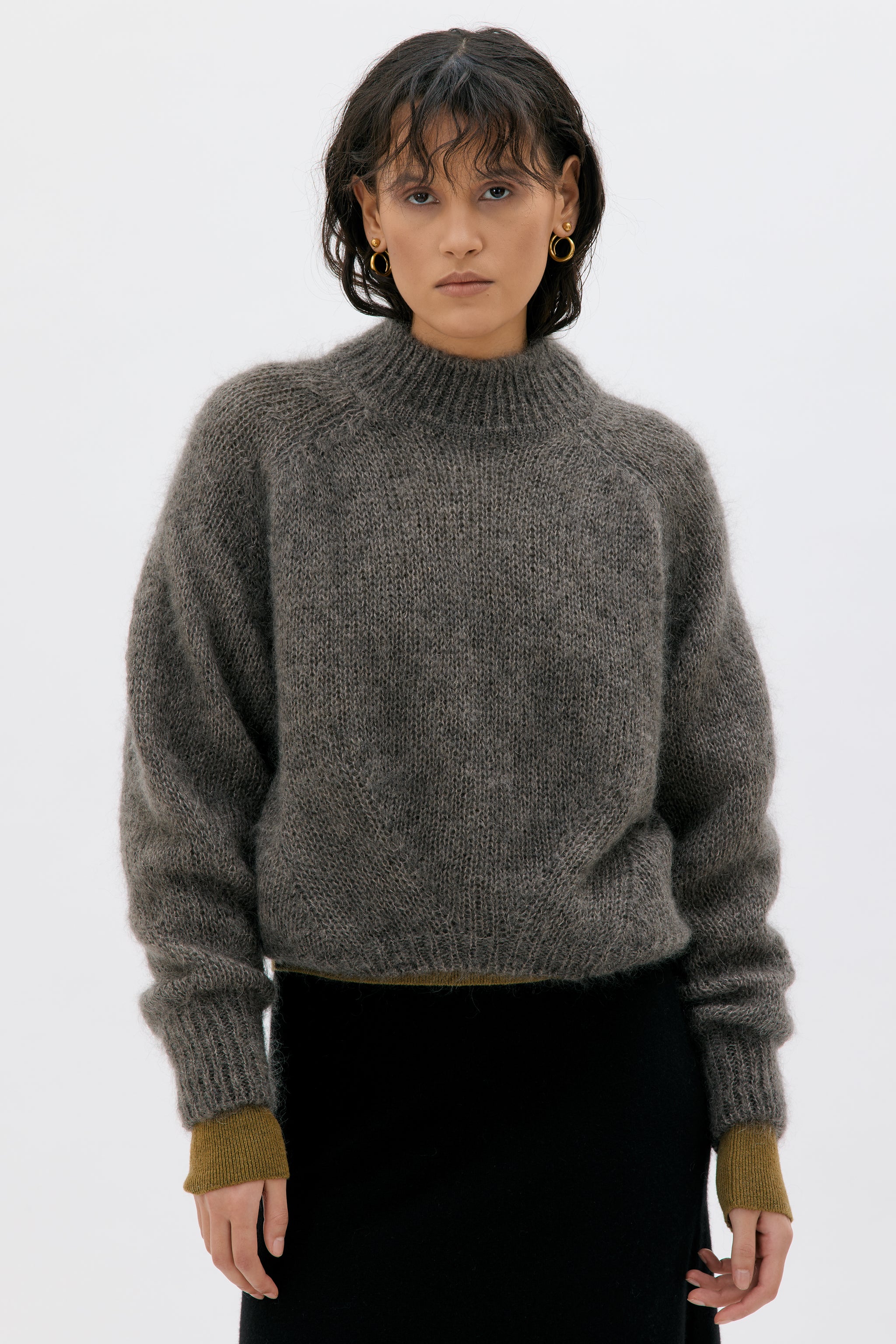 Ein oversized Look, mit Stehkragen und seiner Mischung aus hochwertigen Materialien.